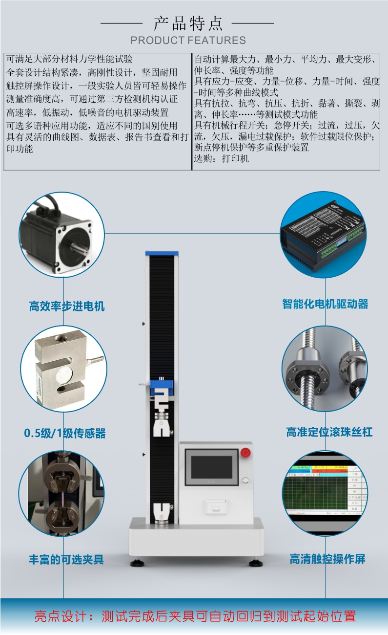 YTN-D系列單柱拉力試驗(yàn)機(jī)采用單柱結(jié)構(gòu),結(jié)構(gòu)牢固,操作方便,維護(hù)簡單。設(shè)備配備了多重保護(hù)裝置,包括機(jī)械行程開關(guān)、急停開關(guān)、過流、過壓、欠流、欠壓、漏電過載保護(hù)等,確保設(shè)備在運(yùn)行過程中的安全性。此外,設(shè)備還具有測試完成后自動(dòng)返回至測試起始位置的自動(dòng)歸位功能,進(jìn)一步提升了操作的便捷性。