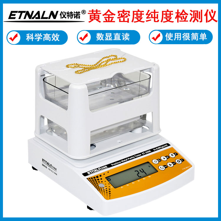 黃金密度計_貴金屬純度檢測儀_黃金首飾檢驗真假的儀器,ET-320K,ET-600K 、ET-1200K系列產(chǎn)品屬升級換代產(chǎn)品,相對于其它競爭產(chǎn)品,本系列產(chǎn)品重點提升了稱重精度,簡化了操作步驟與方式,升級了軟件的應(yīng)用功能,使得測量結(jié)果的可靠性得到進一步提高;并分別具有黃金、鉑金、銀三個含量測量模式及一個合金測量模式。