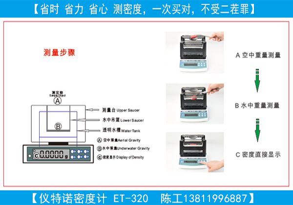 不同型號(hào)的密度計(jì)有效位也有所不同,如ET-120S、ET-220S密度有效位為 0.0001g/cm3,ET-320、ET-600、ET-320M、ET-1200 密度有效位為 0.001 g/cm3。